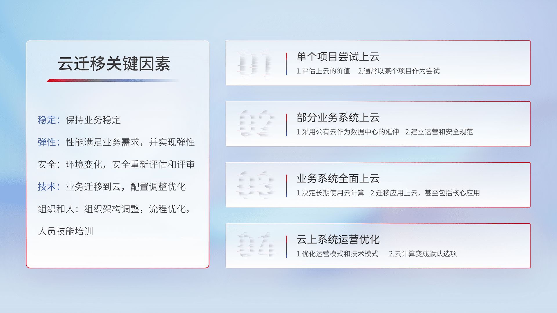 结合实际业务,,,,从规划设计、、、云平台选型、、、云原生改造、、、、数据迁移、、集成交付,,,,迁移全过程为客户识别最佳上云路径,,做好风险识别管理,,设计网络架构、、、身份权限、、安全审计合规、、、操作审计、、、、日志审计、、、、监控告警策略、、、多站点容灾设计等,,,,对云上基础设施进行整体规划,,提升IT治理水平,,以满足弹性、、、、高可用、、、高性能的需求。。